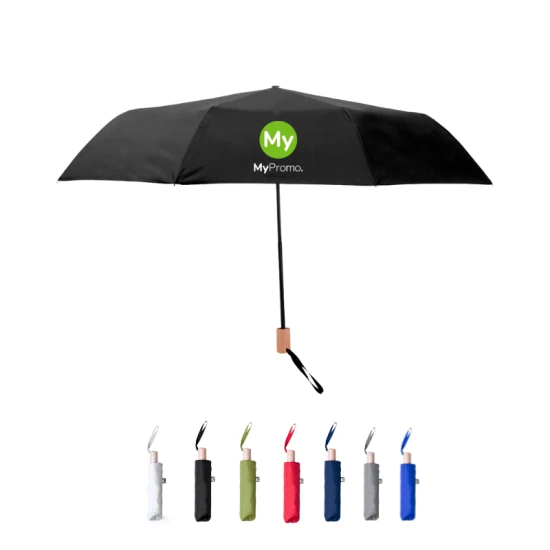 Opvouwbare paraplu met een diameter van 95 cm. In 190T pongee RPET-materiaal, verkregen uit gerecyclede plastic materialen, om het hergebruik van plastic residuen aan te moedigen en bij te dragen aan de duurzaamheid van de aarde. Handmatig openen, met winddicht mechanisme en metalen ribben. Houten handvat, met draagriemen en etui in bijpassende kleuren. RPET onderscheidend label.