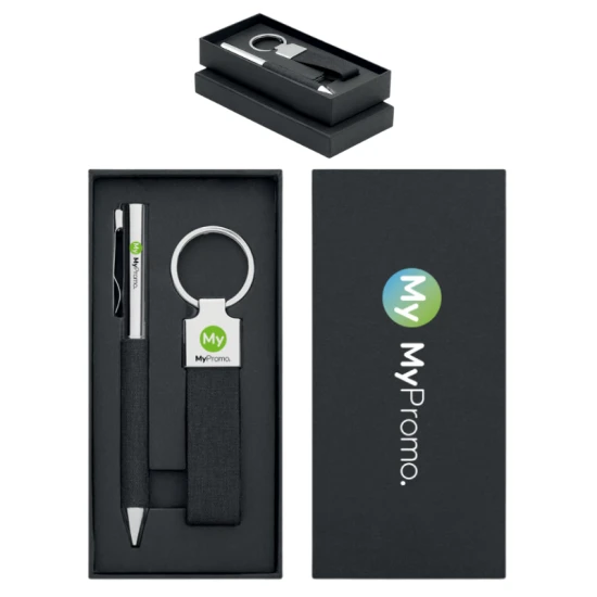 2-delige giftset inclusief metalen balpen met rpet polyester detail en rpet polyester sleutelhanger in geschenkverpakking. blauwe inkt.