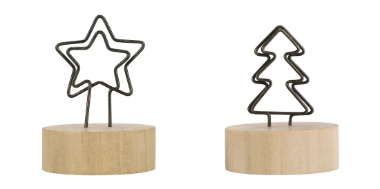 Clip met kerstontwerp. Met metalen clip, ideaal voor het vastzetten van notities, fotos, kaarten of als decoratief detail, met een basis van natuurlijk hout.