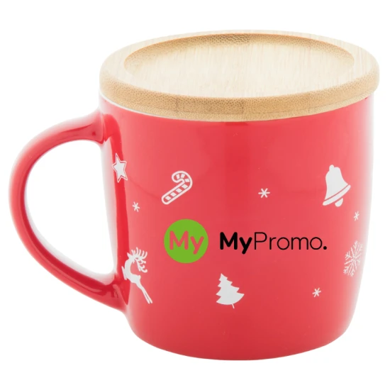 Hoogwaardige keramische mok met bamboe onderzetter en kerstmotief, 370 ml. In kraftpapier doos.