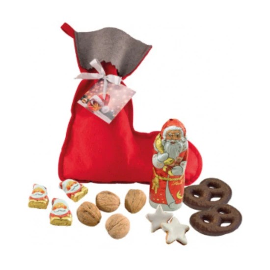 Verras je klanten met deze charmante kerstlaars van vilt. Hij is gevuld met allerlei kerstlekkernijen, of je kunt hem zelf vullen met kleine, zoete verrassingen. Het kaartje biedt ruimte voor je reclame of, vanaf 250 stuks, voor je eigen personalisatie.