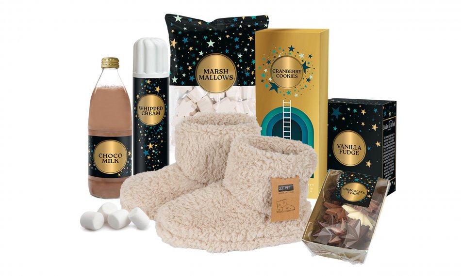 zachte Sloffen Aan, Mokken Gevuld En Lekkers Op Tafel - Dit Pakket Ademt Huiselijke Gezelligheid. Met Chocolademelk, Fudge, Koekjes En Meer Is Het De Perfecte Traktatie Voor Een Knusse Middag Samen. Voor Grote Γ©n Kleine Genieters, Gewoon Lekker Thuis.