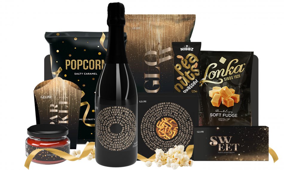 Een Sprankelend Feestje In Een Doos. Een Feestelijk Pakket Vol Knapperige Snacks, Zoete Verwennerij En Een Stijlvol Glaasje Bubbels Zonder Alcohol. Perfect Voor Een Gezellige Avond Vol Smaak, Sfeer En Een Vleugje Glamour. Voor Wie Het Jaar Wil Afsluiten Met Een Glimlach En Wat Glitter.