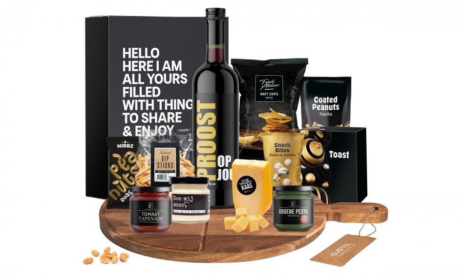 een Borrelpakket Om Van Te Watertanden, Verpakt In Een Feestelijke Kerstdoos. De Sunday Serveerplank Γ35 Cm Vormt Het Middelpunt Van Dit Smaakvolle Cadeau. Met Kaas, Toast, Borrelnoten En Dips Als Pesto En Aioli, Bouw Je In No-time Een Plank Vol Gezelligheid. Voeg Daar Een Glaasje Proost Op Jou Rode Wijn Aan Toe, Een Handje Chips Erbij, En Het Borrelmoment Is Compleet.