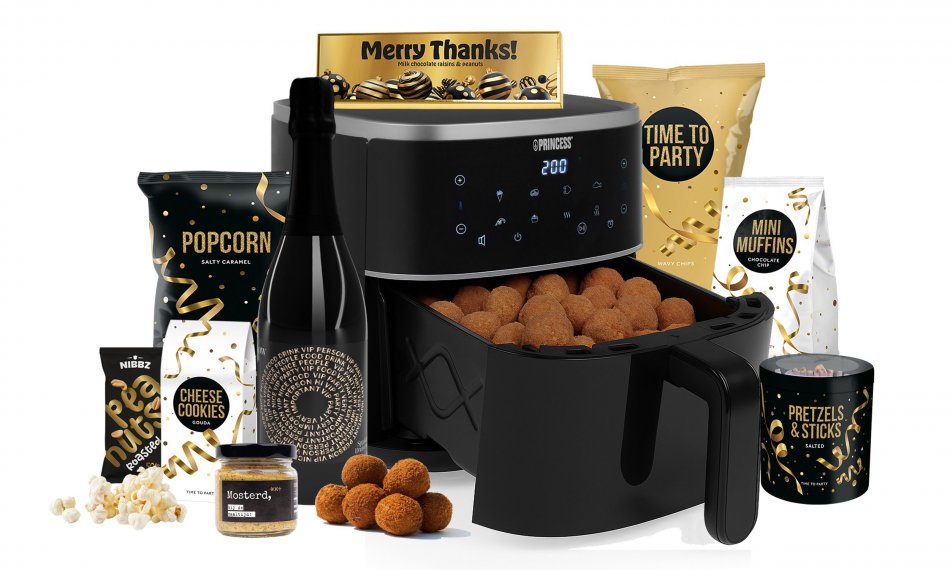 Airfryer Feestpakket, Crispy happiness gegarandeerd. Met de Princess Digital Airfryer (4L) zet je in een handomdraai de lekkerste snacks op tafel. En dat vieren we met een bomvol feestpakket! Denk aan zoete mini muffins, karamelpopcorn, een reep chocola waar je u tegen zegt, en knapperige pretzels en ribbelchips. Voor de hartige fans is er mosterd, kaaskoekjes en natuurlijk: pinda's. Alles weggespoeld met een sprankelend glaasje druivensap. Klinkt goed, toch?