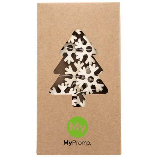 Kerstlicht string decoratie met 20 LED lampjes in houten sneeuwvlok vorm. Werkt met 2 AA batterijen, zonder batterijen. Met AAN/UIT-knop op batterijbehuizing. In kraftpapier doos.