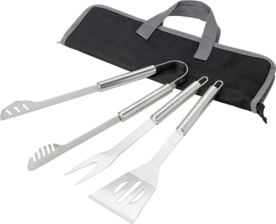 Met deze 3-delige barbecueset ben jij de sterrenkok van de barbecue! De roestvrijstalen set bevat een tang, spatel en vork. Dankzij het RVS-materiaal blijft de set lang mooi en is deze eenvoudig te reinigen. Bewaar de set in het handige non woven draagtasje, waardoor je hem gemakkelijk mee kunt nemen naar feestjes en parken. Door de luxe uitstraling van de set maakt het een perfect relatiegeschenk of promotieartikel. Zo geef jij niet alleen een bruikbaar geschenk, maar laat je tegelijkertijd een professionele en verzorgde indruk achter bij jouw klanten en relaties. Gegarandeerd een succes op iedere barbecue!