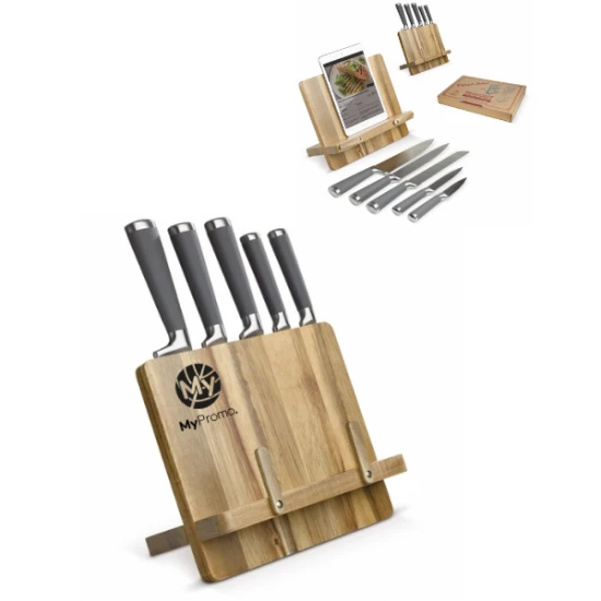 Met deze elegante houten kookboekstandaard houd je jouw favoriete kookboek op de perfecte leesafstand, terwijl je jouw keuken er stijlvol mee aankleedt. Inclusief vijf verschillende messen, zodat je direct aan de slag kunt gaan met het klaarmaken van jouw favoriete gerecht. Het gebruik van acacia hout maakt deze standaard milieuvriendelijk en duurzaam, waardoor je jouw keuken niet alleen leuker, maar ook groener maakt. De standaard wordt geleverd in een prachtige geschenkverpakking en is hierdoor ook ideaal om weg te geven als relatiegeschenk of promotieartikel. Personaliseer de standaard met jouw eigen unieke opdruk en maak indruk op jouw klanten of collega's.