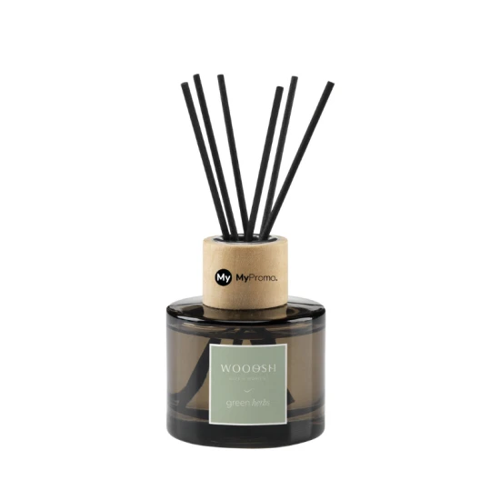 Deze decoratieve parfumfles van glas, met houten accent, van het merk Wooosh is gevuld met een heerlijk geurende parfumolie "Groene Kruiden". Door de stokjes in de parfumfles te plaatsen, wordt het parfum opgenomen en verdampt de olie geleidelijk. De lucht wordt gevuld met een kruidig en natuurlijk aroma, dat een gevoel van harmonie, rust en ontspanning oproept en tegelijkertijd een verfrissend effect heeft. Een aangename geur tijdens het beoefenen van yoga en meditatie, maar ook heilzaam in een wellnessruimte, badkamer of woonkamer. De intensiteit van de geur kan worden aangepast door meer of minder stokjes in de fles te plaatsen. Deze fles is gevuld met 75 ml parfumolie en wordt geleverd met 6 mini-stokjes en een gebruiksaanwijzing.