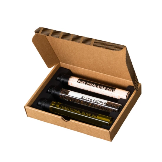 3-Delige kookbox gevuld met 3 glazen tubes Himalayazout, zwarte peper en traditionele olijfolie.