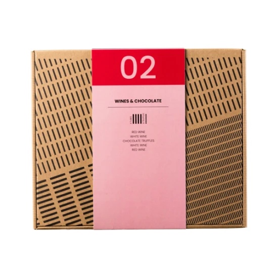 Wijnproeverij in een ambachtelijke geschenkverpakking met 4 glazen 100 ML tubes met wijnen van Domaine de Rombeau en chocoladetruffels. De proeverij bestaat uit 2 rode wijnen, 2 witte wijnen en 8 chocoladetruffels.
