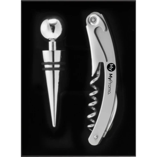 Maak elk feestje compleet met onze 2-delige wijnset inclusief stop van roestvrij staal. Het kelnersmes en de wijnstopper zijn noodzakelijk voor de echte wijnliefhebbers. Beide gemaakt van stevig roestvrij staal, wat zorgt voor een lange levensduur en hoge kwaliteit. Deze wijngeschenkset wordt geleverd in een elegante zwarte geschenkverpakking en is het perfecte geschenk voor werknemers of klanten. Bovendien is deze set voordelig te bedrukken met jouw logo, tekst of ander soort opdruk. Maak indruk op jouw relaties en vraag gelijk een gratis drukproef aan. Proost op een succesvolle samenwerking!