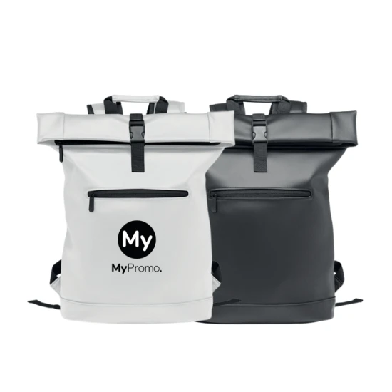 15 inch rolltop laptoprugzak van zacht PU met gewatteerde achterkant en verstevigde bodem. Groot voorvak met rits. De voering is 210D RPET.