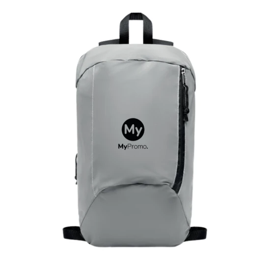 Rugzak van stevig 600D polyester met hoog reflecterend front voor extra zichtbaarheid, handig ritsvak en gewatteerde achterzijde voor extra draagcomfort.