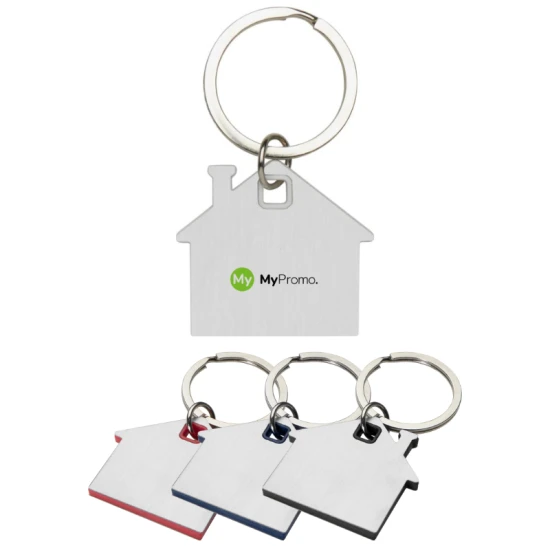 Sleutelhanger in de vorm van een huis, met een roestvrijstalen plaatje met een mat design aan de voor- en achterkant en een gekleurde plastic chip in het midden. Roestvrijstaal, PP Plastic.