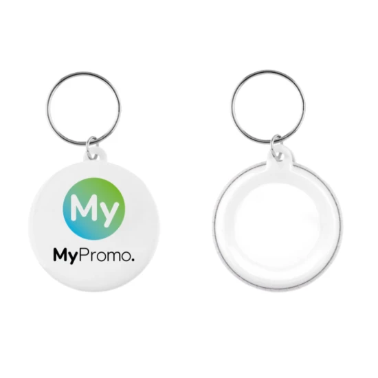 Metalen button met sleutelhanger. Ø4,4 CM. Minimale bestelhoeveelheid 25 stuks. Bij onbedrukte bestellingen wordt het artikel ongemonteerd geleverd.