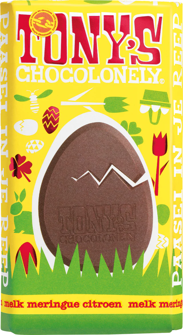 Ik heb het gevonden... het is in deze bar! Tony's paasei in je bar, met de juiste smaakcombinatie. Melkchocolade met meringue (gemaakt van scharreleieren, natuurlijk) en een vleugje citroen. Nog meer paasontbijt vreugde in de verpakking.