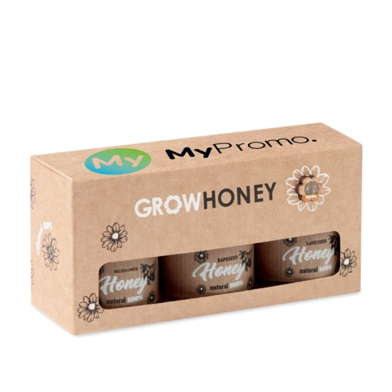 Set van 3 natuurlijke honingpotjes | Honingbij bloemzaadjes | Incl. honingdipper