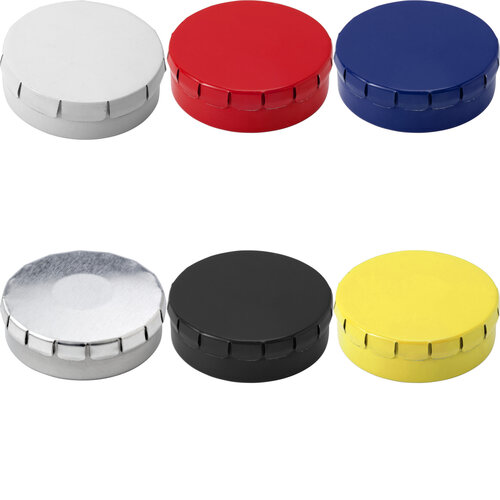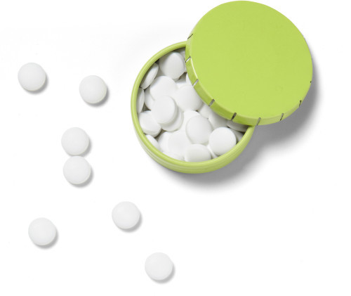 Metalen snoepblikje met 'click-clack' deksel, met ca. 40 suikervrije mintjes.