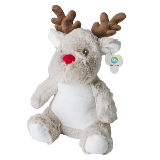Pluche knuffelrendier. Geborduurde ogen. Kan gecombineerd worden met artikel 5013. Inclusief kartonnen label voor bedrukking.