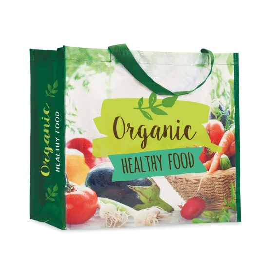 We hebben deze boodschappentas in non-woven stof, non-woven stof met laminering, RPET met laminering en PP stof met laminering.