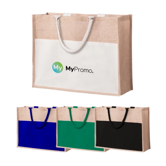 Strandtas van gelamineerd jute met katoenen handvatten en voorvak.