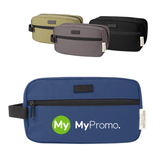 Toilettas gemaakt van GRS-gecertificeerd gerecycled canvas en GRS-gecertificeerde RPET-voering. Voorzien van een voorvak met ritssluiting en een hoofdvak met ritssluiting met organisatievakken en een comfortabele band. Het decoratieve metalen plaatje kan een logo laten opvallen door de subtiele en matte afwerking. Capaciteit: 3,5 liter. 80% GRS gecertificeerd gerecycled katoen en 20% Katoen, 330 g/m2.
