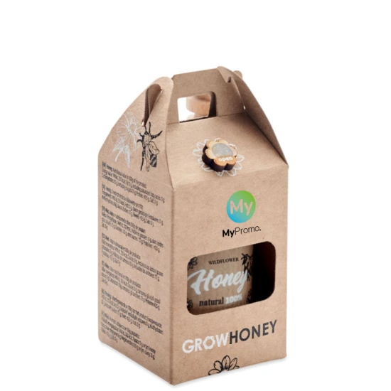 Wilde bloemenhoning in een pot (50g) met een houten honinglepel. Geleverd in een doosje van kraftpapier. Inclusief honingbij bloemzaden. Gemaakt in de EU.