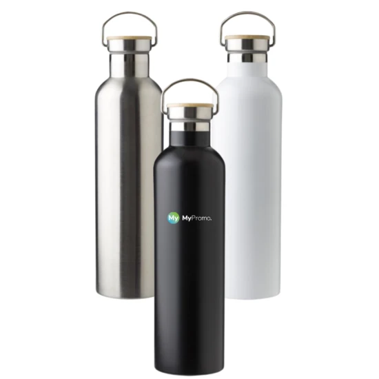RVS fles (1 L), dubbelwandig met draagdeksel en bamboe details.