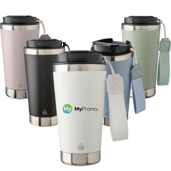 Gerecycled roestvrijstalen dubbelwandige drinkbeker (500 ml) met een PP-dop en bijpassende draagriem. De binnenkant is van roestvrij staal 304 en de buitenkant van roestvrij staal 201. Houdt de inhoud 5 uur warm en 8 uur koud. Gerecycled logo gegraveerd op de fles. Per stuk verpakt in een bruine kartonnen doos.